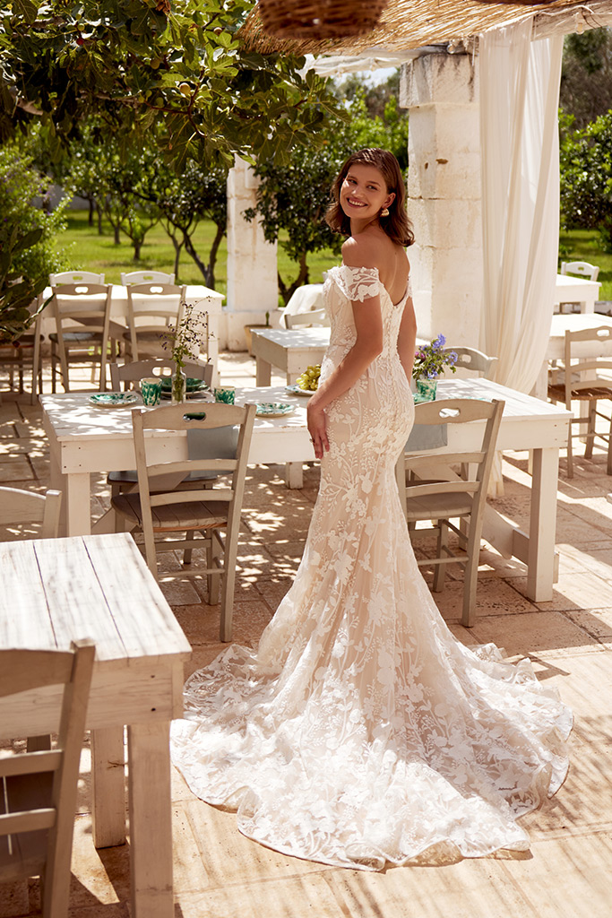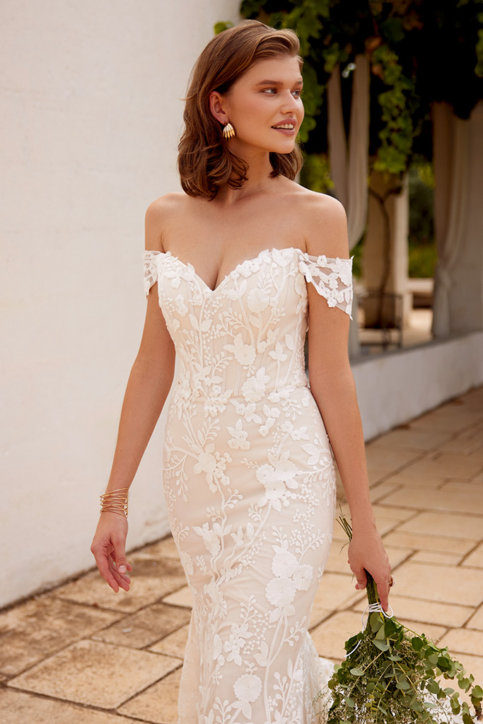 Description: Embroidered Lace Fit and Flare with Off-the-Shoulder Straps.